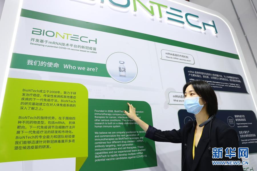 11月5日,在第三屆中國國際進口博覽會上,工作人員在醫(yī)療器械及醫(yī)藥健康展區(qū)介紹由復(fù)星醫(yī)藥與德國拜恩泰科合作開發(fā)的新冠病毒mRNA(信使核糖核酸)疫苗。新華社記者 張玉薇 攝