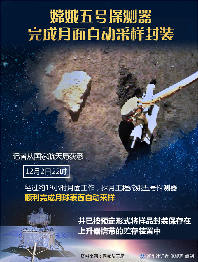 新華社北京12月3日電(記者胡喆)記者3日從國家航天局獲悉,12月2日22時,經(jīng)過約19小時月面工作,探月工程嫦娥五號探測器順利完成月球表面自動采樣,并已按預定形式將樣品封裝保存在上升器攜帶的貯存裝置中。