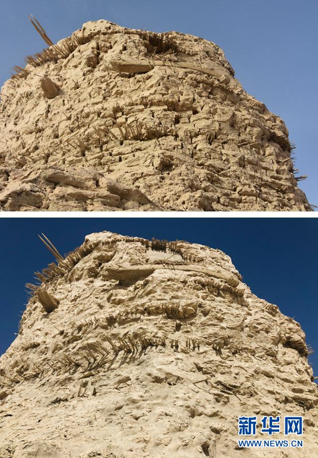 拼版照片:上圖為搶險(xiǎn)加固前的三間房遺址局部(2019年11月14日攝);下圖為搶險(xiǎn)加固后的三間房遺址局部(10月20日攝)。新華社發(fā)