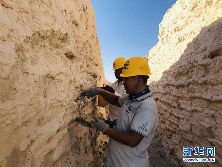 文物保護(hù)工作者在樓蘭古城內(nèi)搶險(xiǎn)加固三間房遺址(9月12日攝)。新華社發(fā)