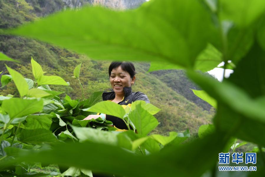 在廣西百色市凌云縣下甲鎮(zhèn)加西村,當?shù)卮迕裨诓烧H~(2019年3月27日攝)。新華社記者 陸波岸 攝