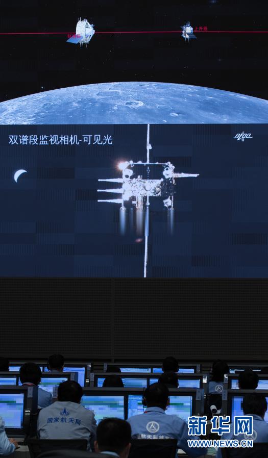 記者從國家航天局獲悉,12月6日5時42分,嫦娥五號上升器成功與軌道器返回器組合體交會對接,并于6時12分將月球樣品容器安全轉(zhuǎn)移至返回器中。這是我國航天器首次實現(xiàn)月球軌道交會對接。新華社記者 金立旺 攝