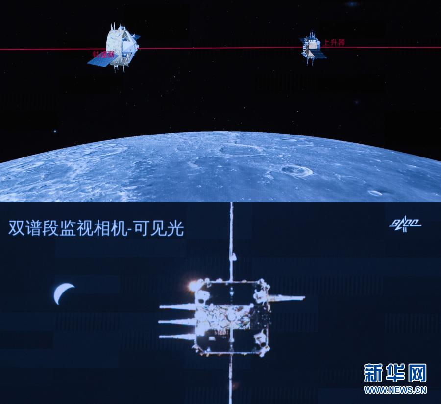 記者從國家航天局獲悉,12月6日5時42分,嫦娥五號上升器成功與軌道器返回器組合體交會對接,并于6時12分將月球樣品容器安全轉(zhuǎn)移至返回器中。這是我國航天器首次實現(xiàn)月球軌道交會對接。新華社記者 金立旺 攝
