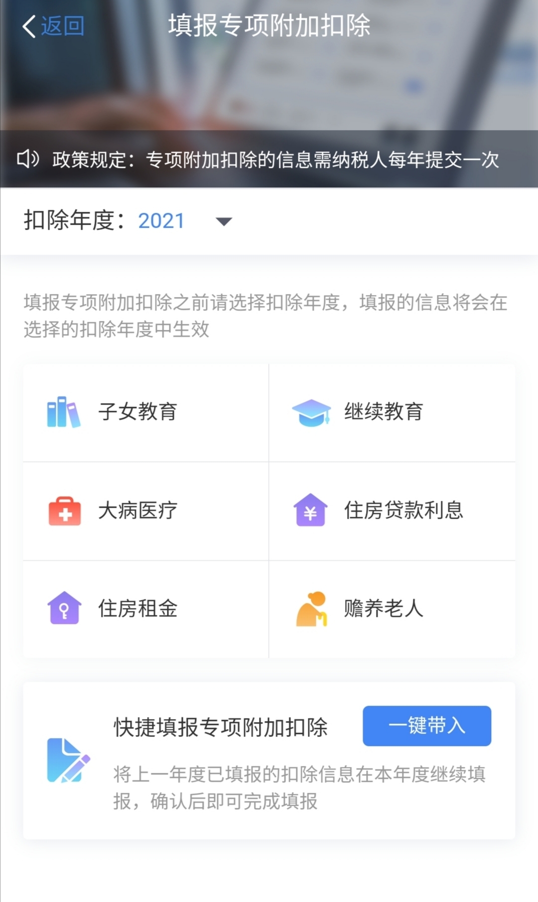 如何確認?納稅人從APP首頁進入“填報專項附加扣除”頁面后,既可以選擇一鍵帶入,即將上一年度已填報的扣除信息在本年度繼續(xù)填報,確認后即可完成填報,也可以按目前自身實際情況逐項填報。若未及時確認,那么已填報的扣除信息將自動視同有效并延長至2021年。