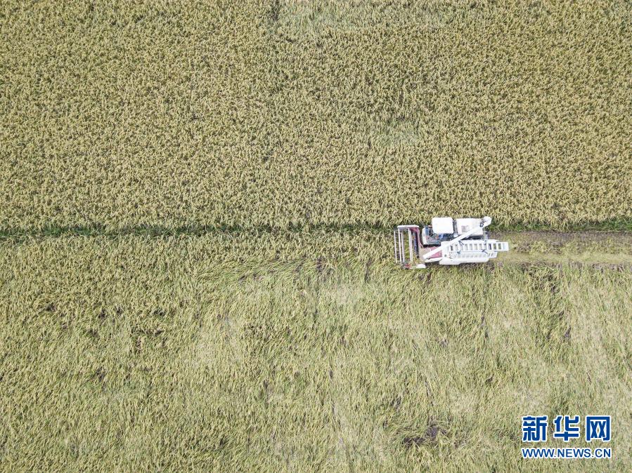 10月22日,工作人員駕駛收割機在海南??邶埲A區(qū)龍泉鎮(zhèn)新江村收割晚稻(無人機照片)。