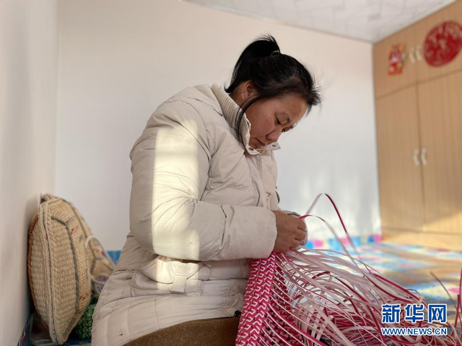 12月20日,在黑龍江省大慶市林甸縣宏偉鄉(xiāng)宏偉村,脫貧戶馬長(zhǎng)蘭在家中編織籃子。新華社記者 楊喆 攝