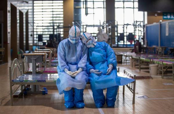 3月10日,武漢武昌方艙醫(yī)院休艙,劉海婷和許國娟自愿報(bào)名去做最后的消殺工作,在等待出艙的時(shí)候,她們覺得有點(diǎn)累,便坐下來休息了一會(huì)兒。
