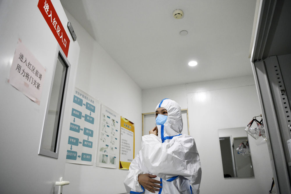 在天津醫(yī)科大學(xué)總醫(yī)院空港醫(yī)院,張碩在戴口罩準(zhǔn)備進(jìn)入“紅區(qū)”工作(12月18日攝)。