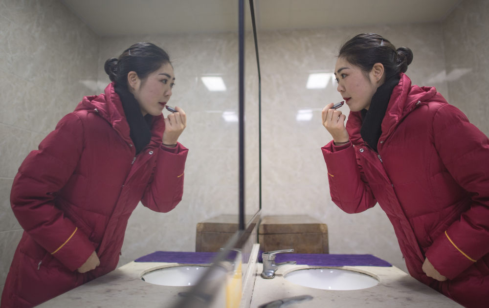 ??12月16日,武漢客運段高鐵乘務員艾婷婷在上班前化妝。