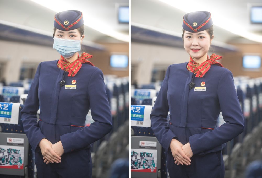 “現(xiàn)在說得最多的就是,請乘客戴好口罩、做好防護。經(jīng)歷了這么大一場疫情,感覺肩上的擔子更重了,做好服務的同時更要確保每一名乘客的安全?!闭驹谟浾呙媲暗闹袊F路武漢局集團有限公司武漢客運段高鐵乘務員艾婷婷20歲剛出頭,言語中顯露出超出同齡人的成熟。