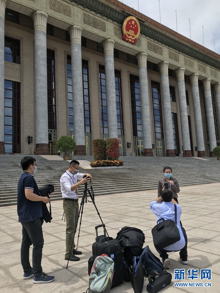 5月20日,全國(guó)政協(xié)十三屆三次會(huì)議召開新聞發(fā)布會(huì)。大會(huì)新聞發(fā)言人郭衛(wèi)民向中外媒體介紹本次大會(huì)有關(guān)情況并回答記者提問。圖為本網(wǎng)記者在人民大會(huì)堂東門外廣場(chǎng)做直播前準(zhǔn)備工作。新華網(wǎng)記者 周紅軍? 攝