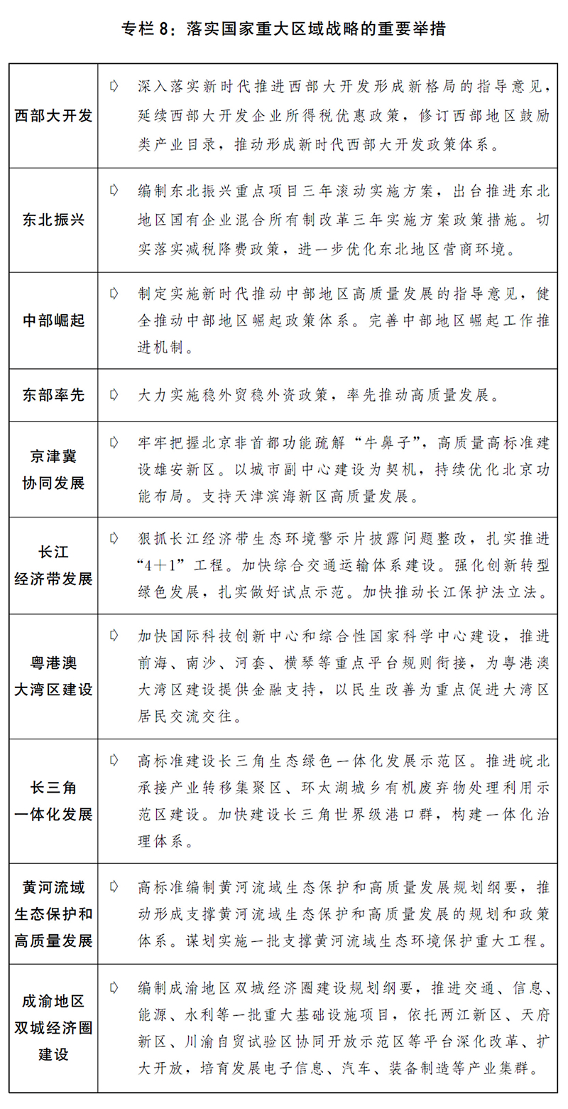 一是落實(shí)落細(xì)重大區(qū)域發(fā)展戰(zhàn)略。落實(shí)區(qū)域協(xié)調(diào)發(fā)展新機(jī)制,持續(xù)推進(jìn)西部大開(kāi)發(fā)形成新格局,支持東北地區(qū)全面振興全方位振興,健全中部地區(qū)崛起政策體系和工作機(jī)制,繼續(xù)推動(dòng)?xùn)|部地區(qū)率先發(fā)展??v深推進(jìn)京津冀協(xié)同發(fā)展,加快實(shí)施雄安新區(qū)重點(diǎn)建設(shè)項(xiàng)目,完善北京非首都功能疏解政策體系。大力推進(jìn)長(zhǎng)江經(jīng)濟(jì)帶生態(tài)環(huán)境突出問(wèn)題整改和系統(tǒng)性保護(hù)修復(fù),加快構(gòu)建綜合交通運(yùn)輸體系,促進(jìn)內(nèi)河船舶改造。推動(dòng)粵港澳大灣區(qū)基礎(chǔ)設(shè)施互聯(lián)互通,有序開(kāi)展國(guó)際科技創(chuàng)新中心建設(shè),加快橫琴、河套等重大合作平臺(tái)建設(shè)。高標(biāo)準(zhǔn)建設(shè)長(zhǎng)三角生態(tài)綠色一體化示范區(qū),推動(dòng)長(zhǎng)三角交通一體化更高質(zhì)量發(fā)展,建設(shè)虹橋國(guó)際開(kāi)放樞紐。抓緊做好黃河流域生態(tài)保護(hù)和高質(zhì)量發(fā)展規(guī)劃綱要編制和出臺(tái)實(shí)施工作。大力支持成渝地區(qū)雙城經(jīng)濟(jì)圈建設(shè),打造全國(guó)高質(zhì)量發(fā)展的重要增長(zhǎng)極。積極推進(jìn)西部陸海新通道建設(shè)。深化對(duì)口支援。支持少數(shù)民族和民族地區(qū)加快發(fā)展。推動(dòng)國(guó)家級(jí)新區(qū)、開(kāi)發(fā)區(qū)等功能平臺(tái)創(chuàng)新提升發(fā)展,加快推進(jìn)資源型地區(qū)經(jīng)濟(jì)轉(zhuǎn)型和老工業(yè)城市更新改造。推動(dòng)山西開(kāi)展能源革命綜合改革試點(diǎn)。繼續(xù)推進(jìn)承接產(chǎn)業(yè)轉(zhuǎn)移示范區(qū)建設(shè),在具備條件的內(nèi)陸城市打造一批高端制造業(yè)基地。制定發(fā)展海洋經(jīng)濟(jì)加快建設(shè)海洋強(qiáng)國(guó)的意見(jiàn)。完善主體功能區(qū)戰(zhàn)略和制度,編制《全國(guó)國(guó)土空間規(guī)劃綱要(2021-2035)》。