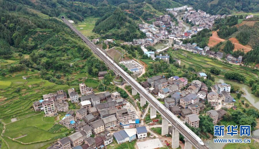 2020年10月4日,一列動車行經(jīng)貴廣高鐵三江侗族自治縣同樂苗族鄉(xiāng)同樂村路段(無人機(jī)照片)。
