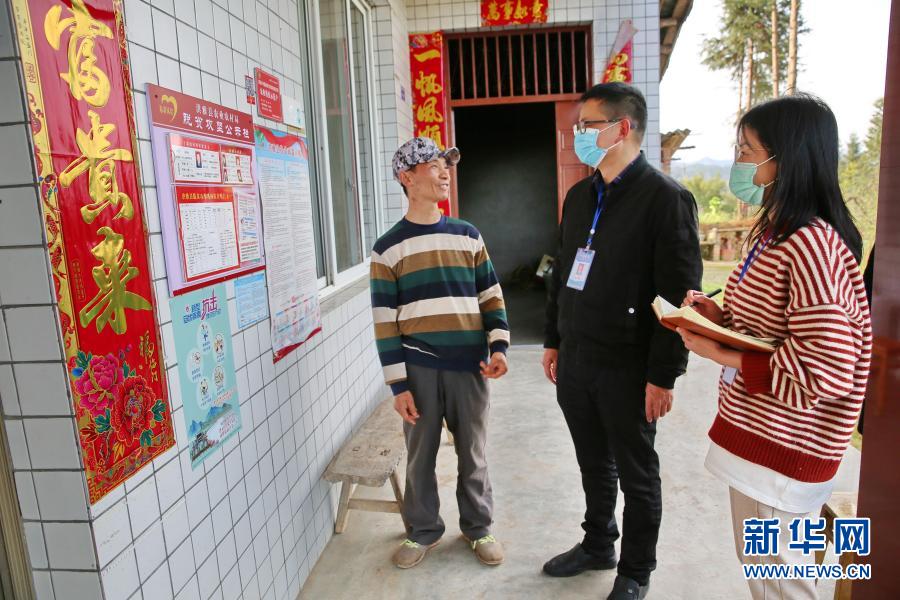 紀(jì)檢監(jiān)察干部向四川洪雅縣中山鎮(zhèn)鄒崗村建檔立卡貧困戶(hù)楊德彬(左一)核實(shí)產(chǎn)業(yè)扶貧資金落實(shí)情況(2020年3月18日攝)。新華社記者 江宏景 攝