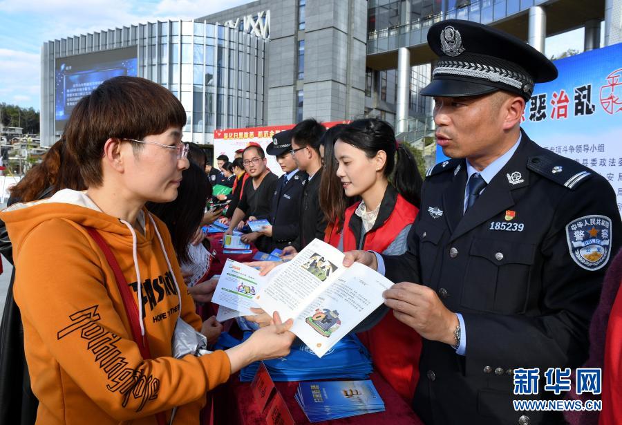 福建省福州市永泰縣公安干警在掃黑除惡專(zhuān)項(xiàng)斗爭(zhēng)宣傳活動(dòng)上向群眾介紹專(zhuān)項(xiàng)斗爭(zhēng)成果(2020年1月6日攝)。新華社記者 張國(guó)俊 攝