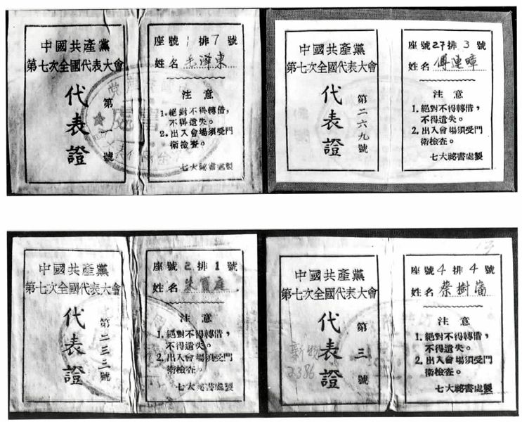 中共“七大”代表毛澤東等人的代表證。 新華社圖片