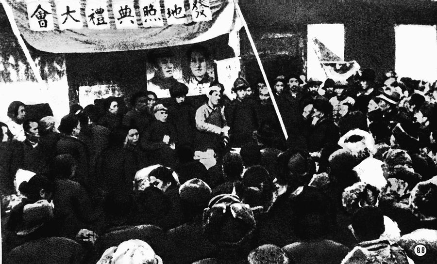 冀中農(nóng)民舉行擁護(hù)土地改革運動大會。 新華社圖片