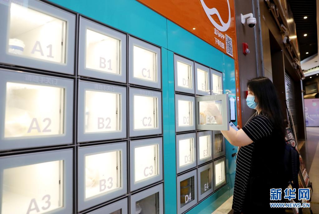 一位顧客通過APP掃碼,在上海地鐵13號(hào)線世博會(huì)博物館地鐵站附近的一家盒小馬服務(wù)點(diǎn)取餐柜中拿取預(yù)定的早餐(2020年7月17日攝)。新華社記者 方喆 攝