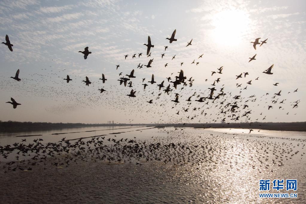 成群羅紋鴨在湖南西洞庭湖國家級自然保護區(qū)飛翔(2020年11月11日攝,無人機照片)。新華社記者 陳思汗 攝