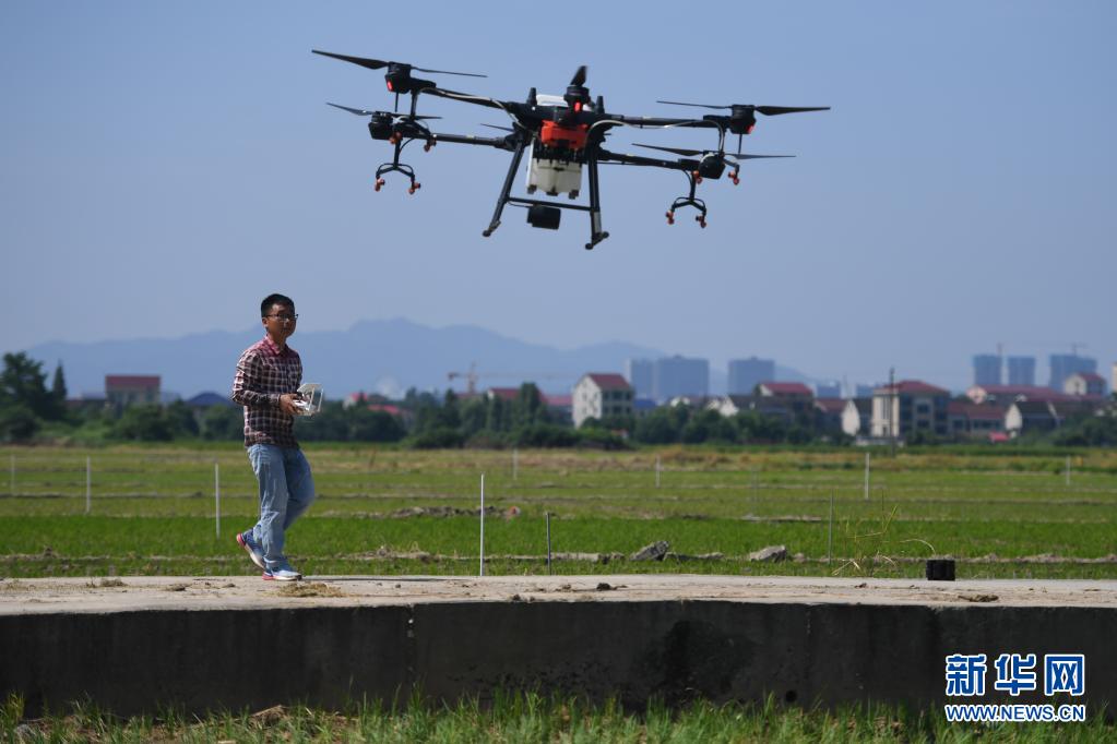 工作人員在湖南省益陽市赫山區(qū)米香村的稻田旁操控?zé)o人機給晚稻打藥(2020年7月23日攝)。新華社記者 薛宇舸 攝