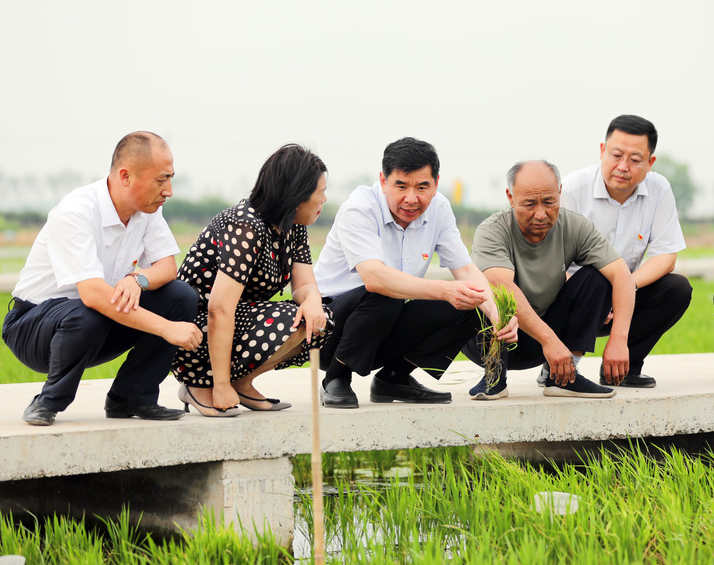日前,劉斯杰(左三)在東營市墾利區(qū)耐鹽堿水稻實(shí)驗(yàn)基地察看水稻長勢。(墾利區(qū)委宣傳部提供)