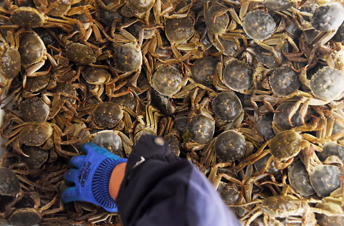 秋季,東營黃河口大閘蟹養(yǎng)殖區(qū)工人撿拾大閘蟹的情景。新華社記者 王凱攝
