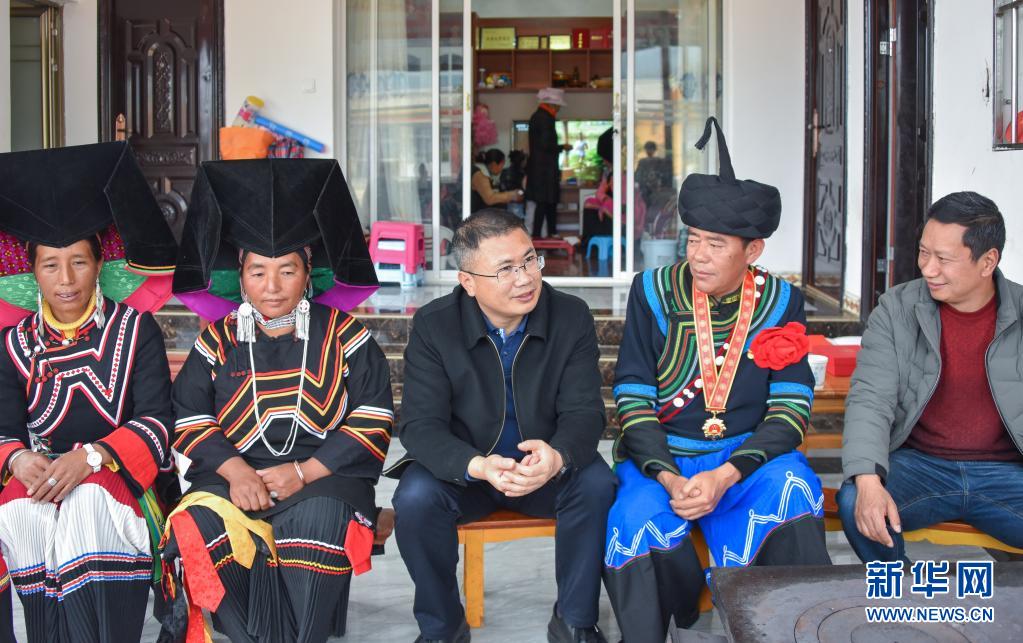 聶金輝(中)在老君山鎮(zhèn)新和村易地扶貧搬遷安置點(diǎn)索瑪小鎮(zhèn)看望慰問(wèn)彝族群眾(3月3日攝)。新華社發(fā)(劍川縣融媒體中心供圖)