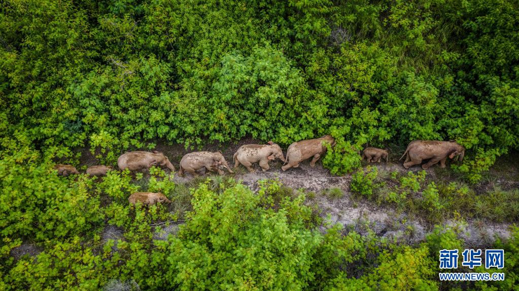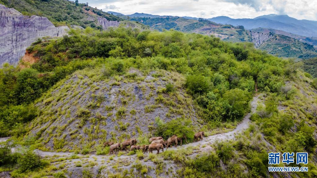 這是5月28日在云南省玉溪市峨山縣境內(nèi)拍攝的象群(無人機照片)。新華社記者 胡超 攝