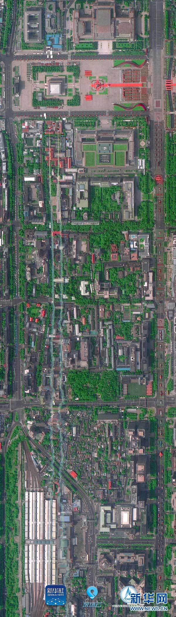 這是“高景1號(hào)”拍攝的拉出彩煙的空中梯隊(duì)即將通過(guò)天安門廣場(chǎng)上空(10月1日攝)。 10月1日上午,慶祝中華人民共和國(guó)成立70周年大會(huì)在北京天安門廣場(chǎng)隆重舉行。新華社聯(lián)合多家單位調(diào)用多顆國(guó)產(chǎn)衛(wèi)星俯瞰閱兵,從“最高機(jī)位”發(fā)回這三張珍貴的長(zhǎng)安街全畫幅衛(wèi)星圖。 新華社發(fā)(中國(guó)四維測(cè)繪技術(shù)有限公司提供)