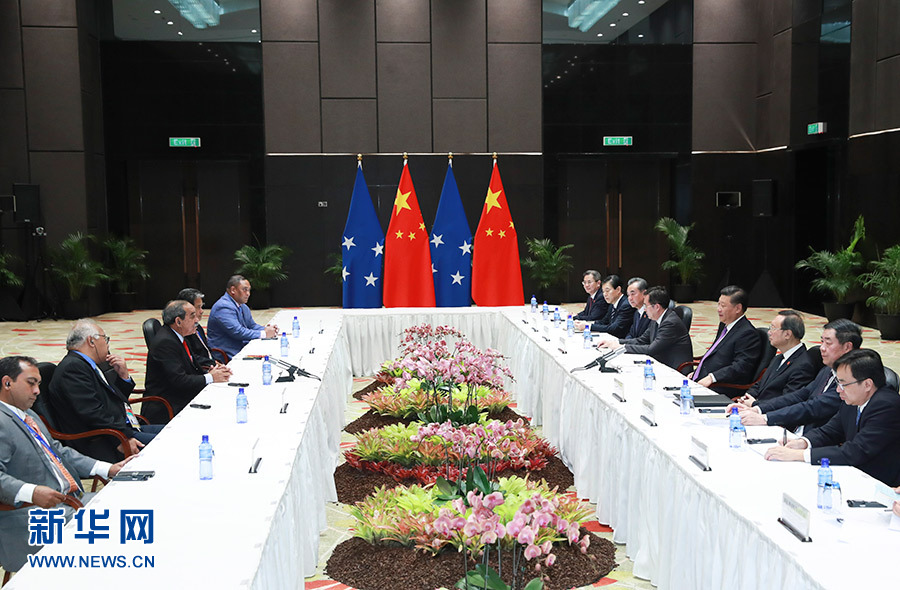 11月16日,國家主席習近平在莫爾茲比港分別會見建交太平洋島國領導人。這是習近平會見密克羅尼西亞聯(lián)邦總統(tǒng)克里斯琴。 新華社記者 龐興雷 攝