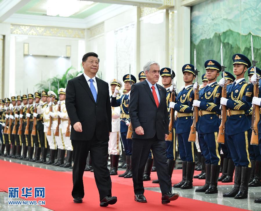 4月24日,國(guó)家主席習(xí)近平在北京人民大會(huì)堂同智利總統(tǒng)皮涅拉舉行會(huì)談。這是會(huì)談前,習(xí)近平在人民大會(huì)堂北大廳為皮涅拉舉行歡迎儀式。 新華社記者 饒愛(ài)民 攝
