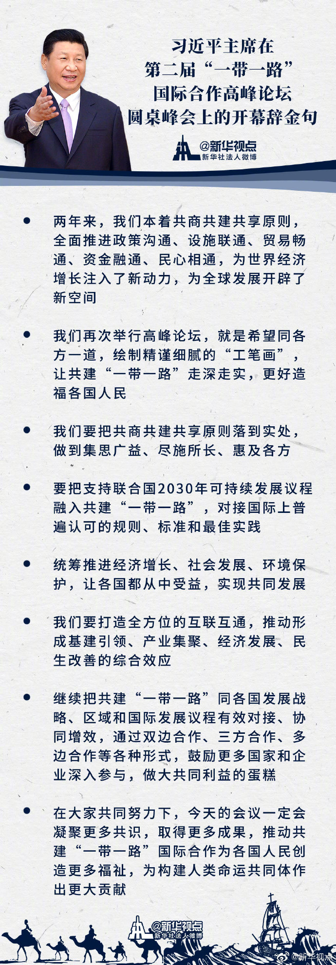 一圖速覽習近平主席在第二屆“一帶一路”國際合作高峰論壇圓桌峰會上的開幕辭金句