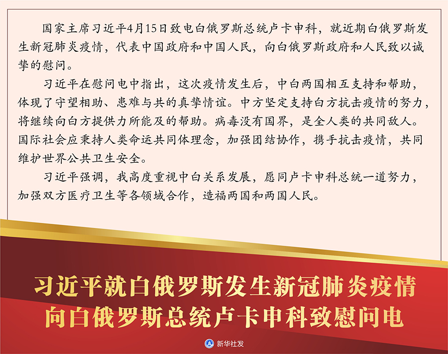 新華社北京4月17日電? 國家主席習近平4月15日致電白俄羅斯總統(tǒng)盧卡申科,就近期白俄羅斯發(fā)生新冠肺炎疫情,代表中國政府和中國人民,向白俄羅斯政府和人民致以誠摯的慰問。