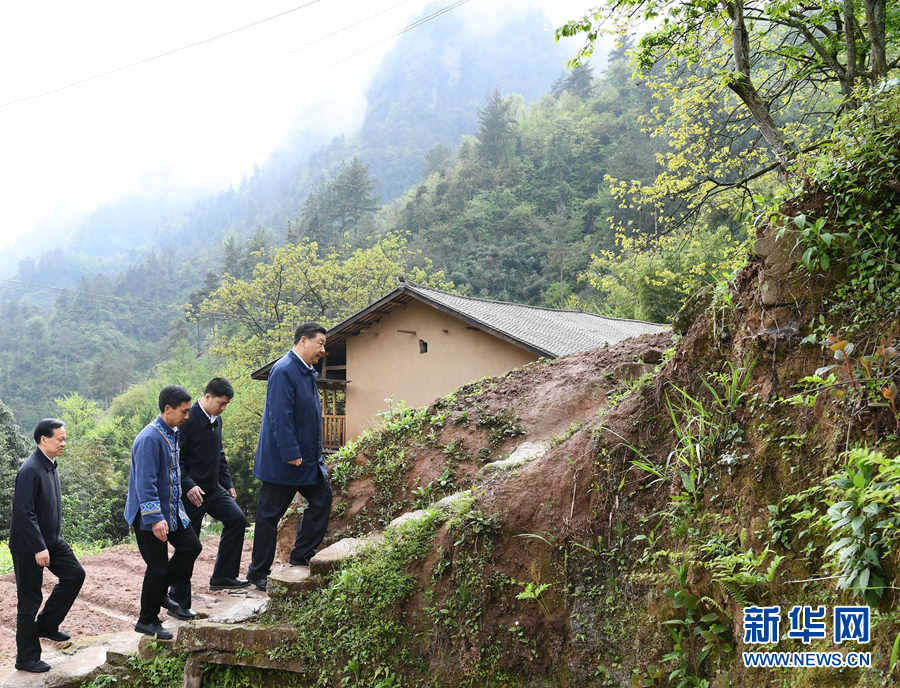 2019年4月15日至17日,習(xí)近平在重慶主持召開(kāi)解決“兩不愁三保障”突出問(wèn)題座談會(huì)。這是4月15日下午,在石柱土家族自治縣中益鄉(xiāng)華溪村,習(xí)近平踏著濕滑的上坡石階,前往貧困戶譚登周家看望。 新華社記者 謝環(huán)馳 攝