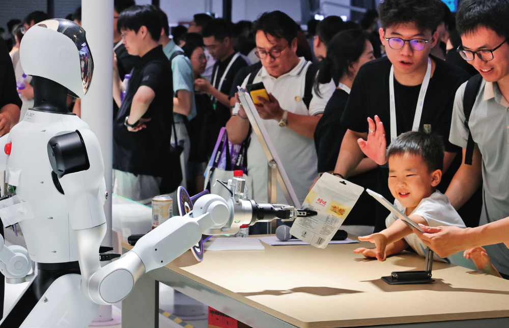 在上海举行的 2025 世界人工智能大会展览现场,小朋友从一个服务机器人“手”中接过自己选购的商品(2025年7月26日摄) 方喆摄/本刊