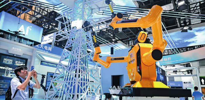 参观者在 2025 世界人工智能大会展览现场中国南方电网展区拍摄“悟空”带电作业机器人(2025年7月28日摄) 陈浩明摄/本刊
