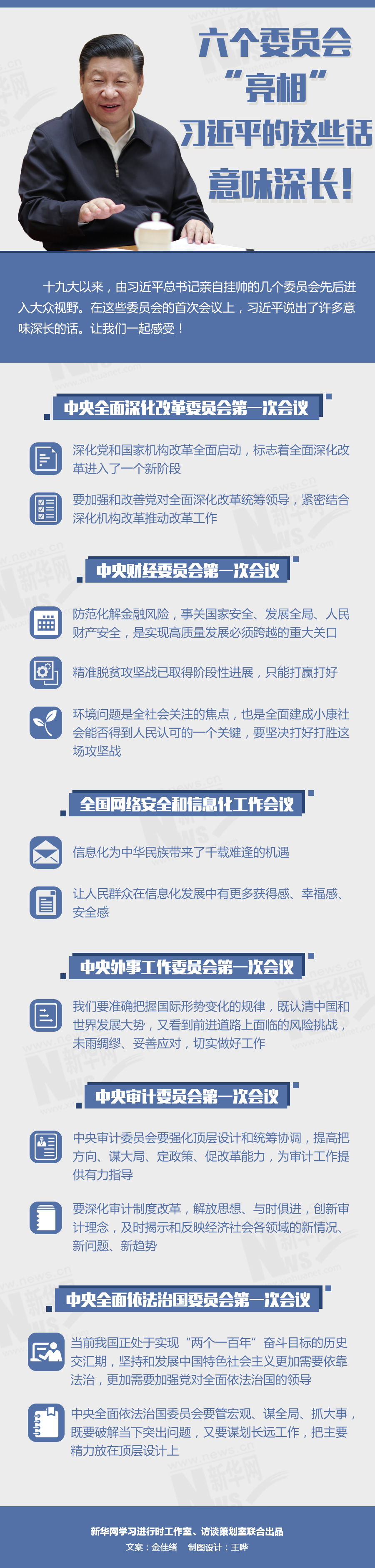 自此之后,中央財(cái)經(jīng)委員會、中央網(wǎng)絡(luò)安全和信息化委員會、中央外事工作委員會、中央審計(jì)委員會、中央全面依法治國委員會先后進(jìn)入大眾視野。習(xí)近平親自掛帥,主持召開各個(gè)委員會“首會”并發(fā)表重要講話。