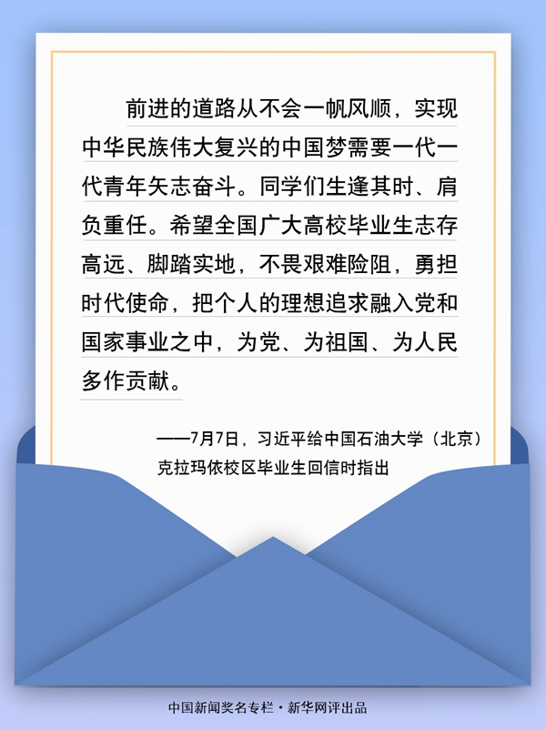 近日,中國石油大學(xué)(北京)克拉瑪依校區(qū)的118名畢業(yè)生給習(xí)近平總書記寫信,匯報(bào)了大學(xué)四年學(xué)習(xí)和思想上的收獲,表達(dá)了扎根西部、建設(shè)邊疆的堅(jiān)強(qiáng)決心。總書記回信肯定他們到邊疆基層工作的選擇,并對(duì)廣大高校畢業(yè)生提出殷切期望。