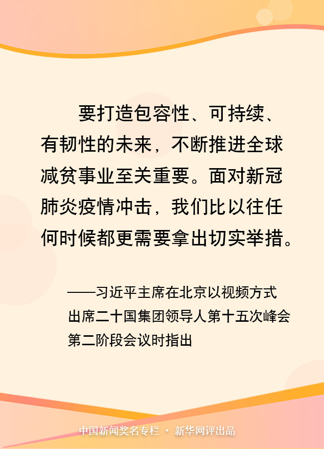 11月22日晚,習(xí)近平主席在北京以視頻方式出席二十國(guó)集團(tuán)領(lǐng)導(dǎo)人第十五次峰會(huì)第二階段會(huì)議,重點(diǎn)闡述關(guān)于可持續(xù)發(fā)展問(wèn)題的看法。他指出,要打造包容性、可持續(xù)、有韌性的未來(lái),不斷推進(jìn)全球減貧事業(yè)至關(guān)重要。面對(duì)新冠肺炎疫情沖擊,我們比以往任何時(shí)候都更需要拿出切實(shí)舉措。