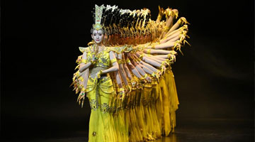 8月15日,模特在艺术节开幕式上展示用废弃布料设计制作的礼服。