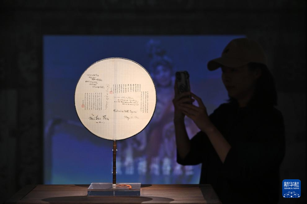 9月12日,观众拍摄印度诗人泰戈尔为梅兰芳书写的团扇。