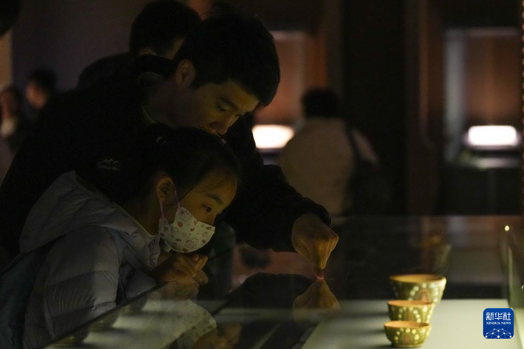 1月21日,观众在“聚宝之盆——新疆文物珍品展”观赏黑人百戏俑。