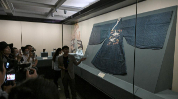 这是5月26日在“彩画千年——中国官式彩画传承与创新展”上拍摄的用彩画元素创作的服饰系列作品。