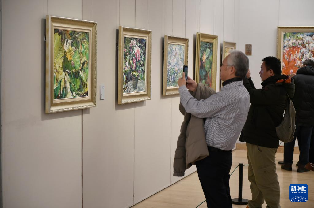 12月21日,参观者在中国美术馆拍摄展出作品《春满牡丹园》。