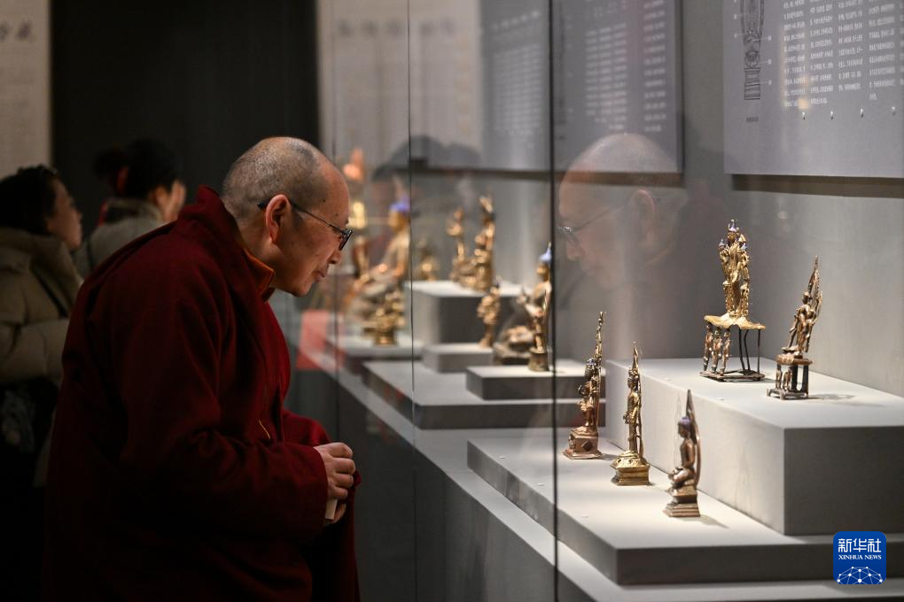 2月9日,参观者在展览上观看尼泊尔菩萨造像。