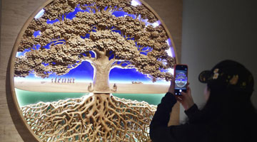 4月4日,在2026亚洲数字艺术展现场,工作人员(左一)为观众讲解作品。