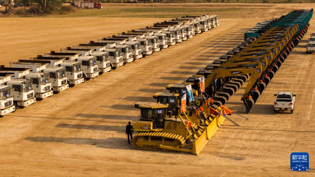 这是4月11日在柬埔寨茶胶省拍摄的扶南德佐综合水利项目的施工车辆和工程机械(无人机照片)。