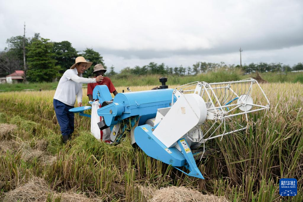 在莫桑比克马普托省温贝卢齐农业站,连片稻田已进入收获季节。微风拂过,金黄色的稻穗随风起伏,两台小型收割机在田间来回作业,一派丰收景象。