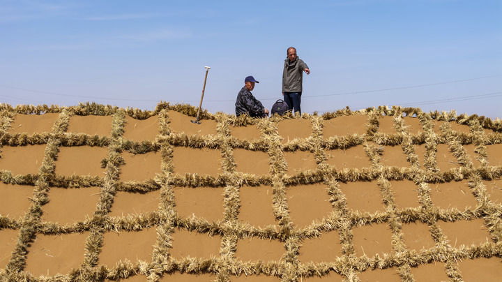 暮春时节,驱车行驶在宁夏中卫境内的腾格里沙漠东南缘,沙脊线上,治沙工人展开一捆捆刷状草绳纵横铺设,仿佛为沙丘披上“格子衫”。