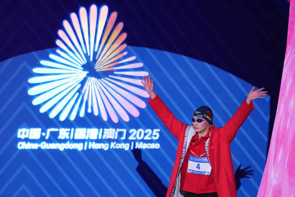 2025年11月16日,第十五届全国运动会游泳女子800米自由泳决赛在深圳举行。图为河北队选手李冰洁在比赛前入场,她最终夺得冠军。新华社记者 杜宇 摄